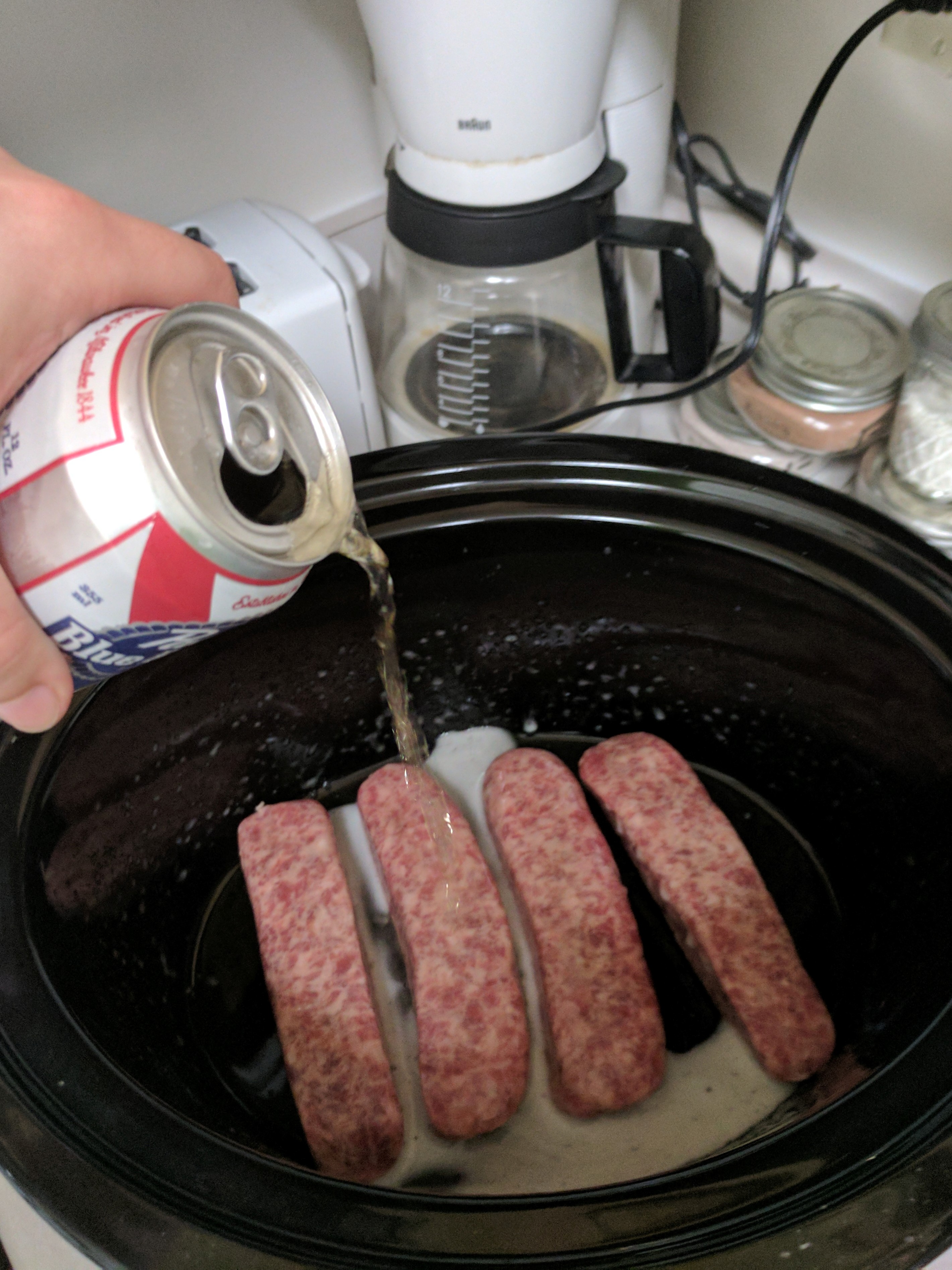 First, I started with the crockpot cook method. The concept here is that you put your brats in the crockpot, add a can or two of beer and then let them chill while the brats absorb the beer and cook away.