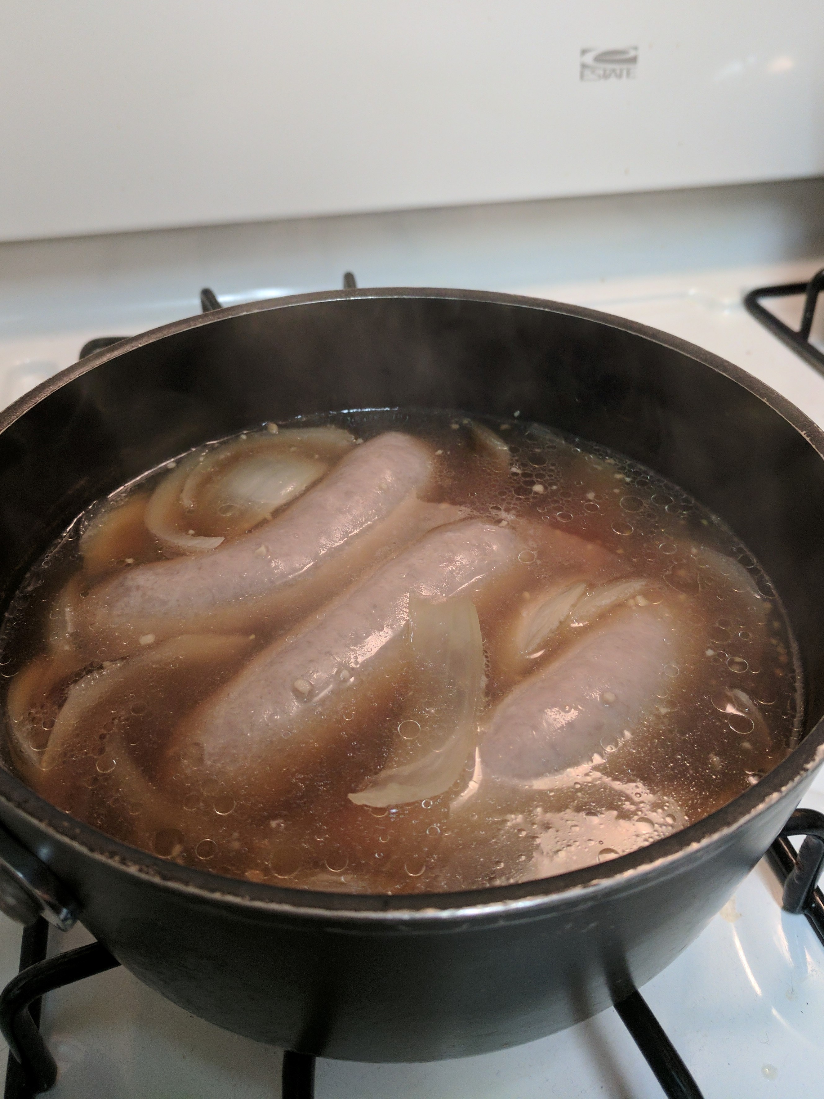 The second method attempted was the boiled and grilled method. These brats were brought to a boil in beer, beef broth, onion, and garlic, then left to simmer until they are removed and placed on the grill.