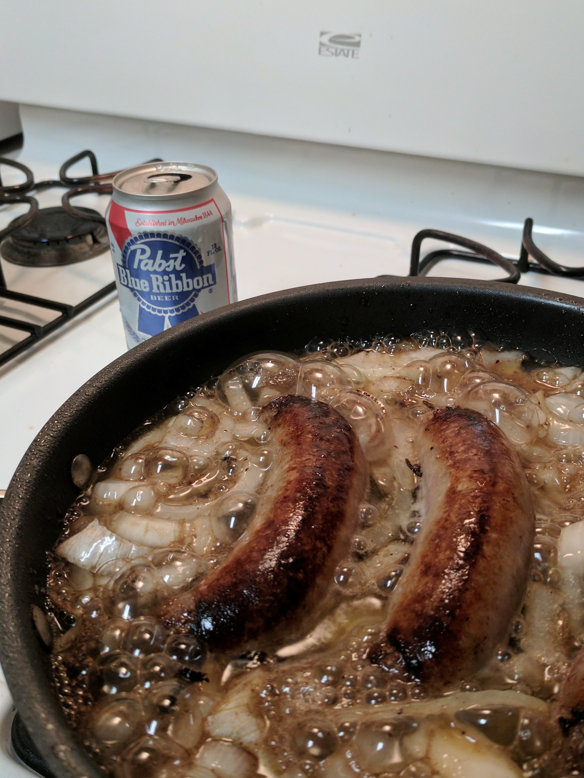 The third and final method was the sear and boil method. These were seared for 3-5 minutes on each side then sweated with onions. Once they were sweated, the beer was added and they simmered until done.