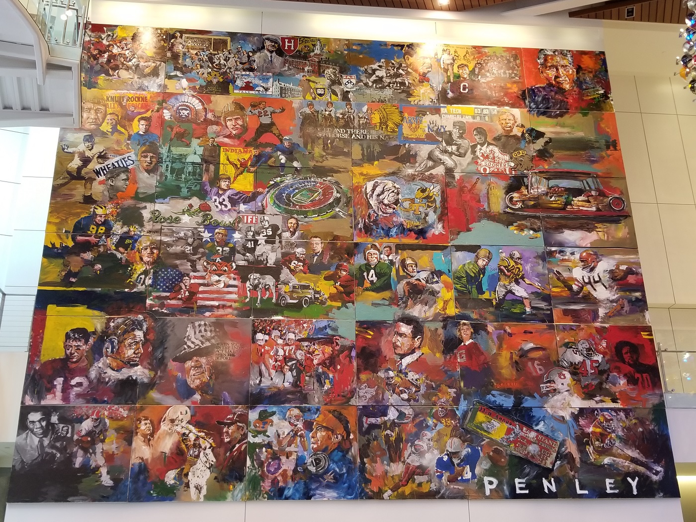 The College Football Hall of Fame is a location that has been on my list to visit since it open in Atlanta. Once I had another reason to be in Atlanta, I told myself I would take a tour to check it out. The first thing that caught my eye was the painting of important figures and events to my left. After noticing the painting, the wall of helmets became the main attraction. There is a helmet on display for every school that is represented in the Hall of Fame.